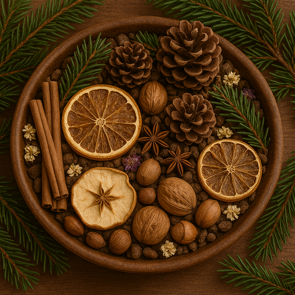 Potpourri "Vůně lesa" je směs sušených vonných rostlin, koření, květin a plodů, která slouží k provonění místností. V dřevěné misce nebo ve sklenici slouží i jako dekorace.